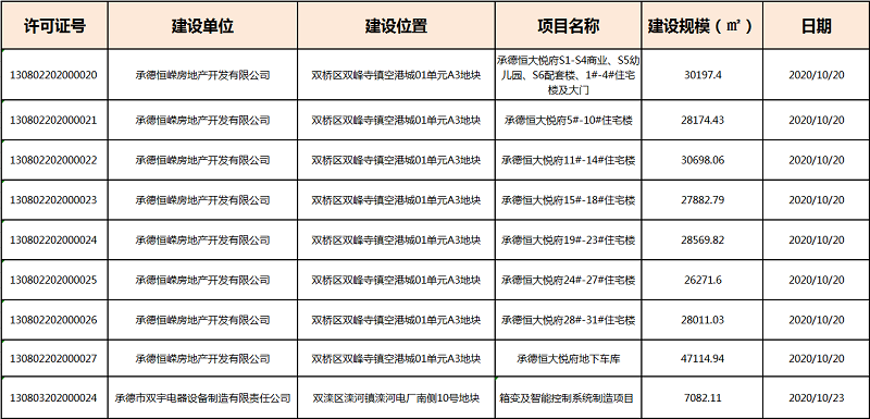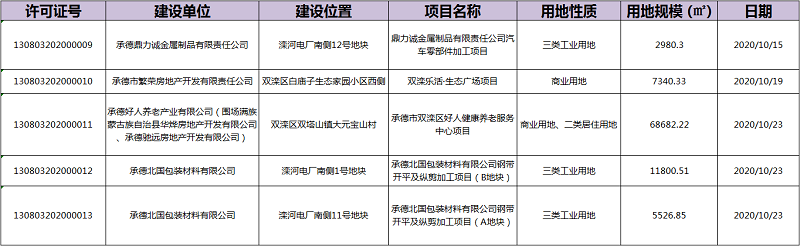 嗖嗖找房承德房产网从承德市自然资源和规划局官网获悉,承德市2020年10月23日建设工程规划许可证核发情况以及建设用地规划许可证核发情况。详细信息见下表: